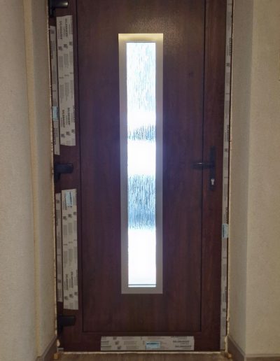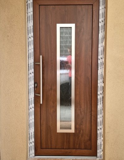 Gealan műanyag bejárati ajtó 3 rétegű fokozott hőszigetelésű üveggel ellátott díszpanellel, kívül-belül dió színben kiszállítva beépítve.