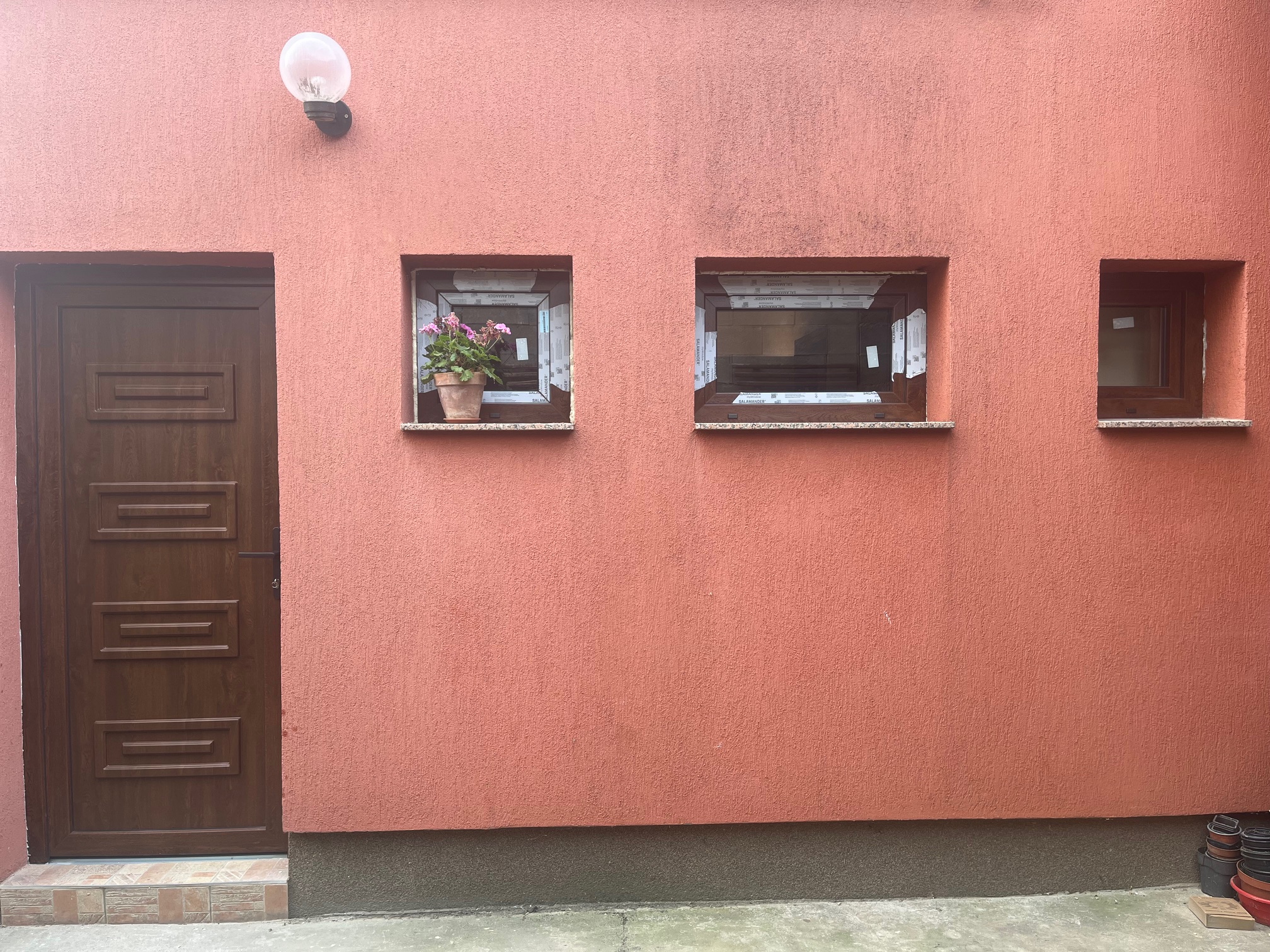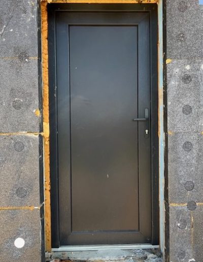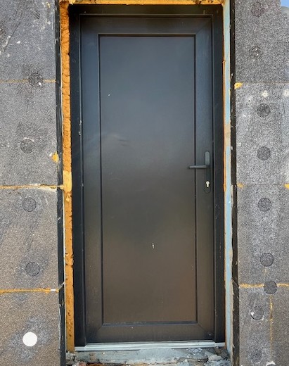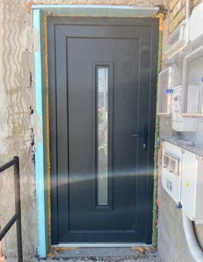 Műanyag bejárati ajtó antracitszürke tömör hőszigetelt stadúrral letisztul dizájn, méretre gyártva beépítve.
