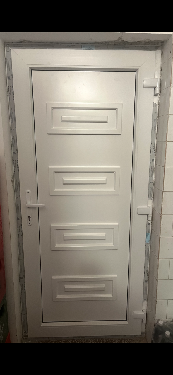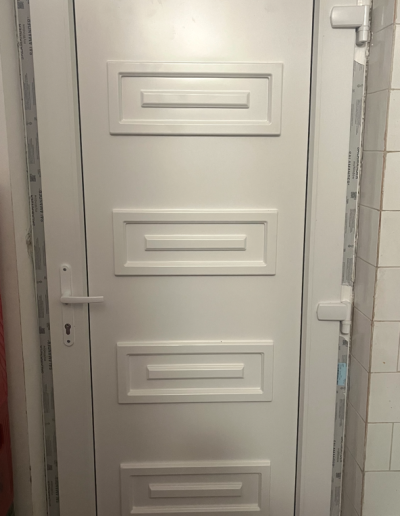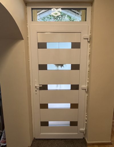 Fehér műanyag bejárati ajtó méretre gyártva, 36mm-er vastag 3 rétgű üveggel ellátott Dahlia II díszpanellel.